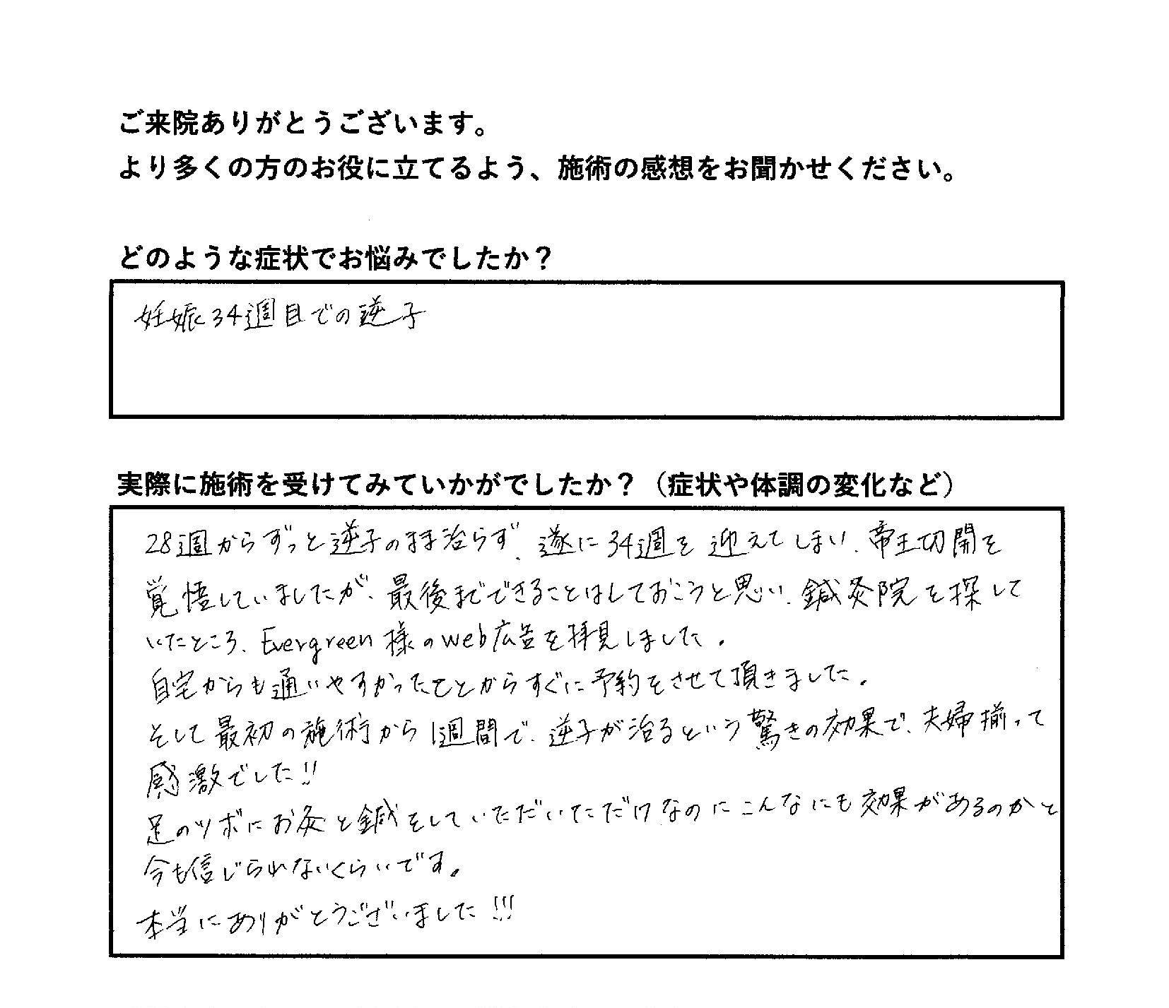 今回のケースでは、初回来院が妊娠34週とギリギリだったのですが、3回の施術で無事に頭位に返りました。